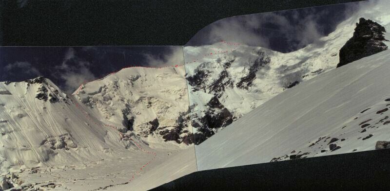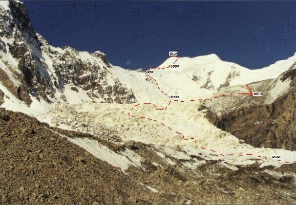 предвершинные обрывы 6987, а сама седловина немного правее по склону. Пройдя
