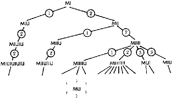 РИС. 11. Показано систематическое построение "дерева" всех теорем MIU-СИСТЕМЫ. N-нный уровень внизу содержит те теоремы, происхождение которых требует точно N шагов. Числа в кружочках сообщают, какое правило использовалось на данной ветке дерева. Находится ли MU где-нибудь в этом дереве? Однако, не совсем ясно как долго надо ждать появления вожделенной цепочки символов, ведь теоремы занесена в этот список в порядке длинны своего происхождения. Это не очень полезный порядок, если вы интересуетесь конкретной цепочкой (типа MU). И если вы не можете даже знать действительно ли эта цепочка когда-либо будет получена, то тем более не можете ведать, как много шагов для ее вывода потребуется! Но теперь объясним предложенный ранее "способ" отличить теоремы от не теорем