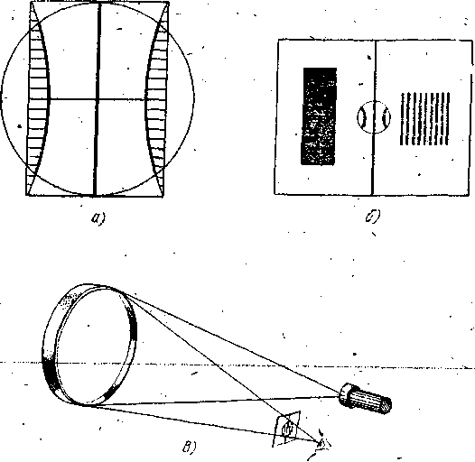 Для того чтобы испытывать форму зеркала, нам придется построить несложное устройство -- теневой прибор (рис. 2), этот прибор в простейшем виде состоит из батарейки для карманного фонаря, лампочки и лезвия бритвы, но позволяет видеть ошибки на поверхности зеркала в 0,05 мкм, чаще же удается получить зеркало с еще большей точностью, хотя качество изображения наблюдаемых объектов от этого уже и не улучшится. Дело в том, что существует определенный предел точности, после которого изображение остается одинаково совершенным. Этот предел равен для зеркала 1/8 длины волны света. Для средней части солнечного спектра, к которой более всего чувствителен человеческий глаз, длина волны равна 0,00056 мм или 0,56 мкм. 1/8 часть этой величины составит 0,07 мкм, Если ошибки ("ямы", "бугры") на поверхности зеркала превышают эту величину, они портят изображение, если не превышают, изображение становится идеальным, и дальнейшее совершенствование зеркала не улучшит качества изображения. Мы добьемся того, чтобы наше зеркало стало идеальным.