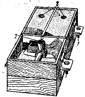 2. Устанавливаем нижнюю опоку 1 (рис. 98), припудриваем модель 3 тальком. Через сито наносим на модель мелкий (облицовочный) песок или тальк. Насыпаем лопаткой формовочную землю 2 с трамбовкой сначала возле модели и стенок и углов опоки.