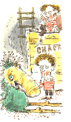 В следующей сцене Близнецы, меняясь, таскают по очереди порох, Шпион деньги. Налетают друг на друга.