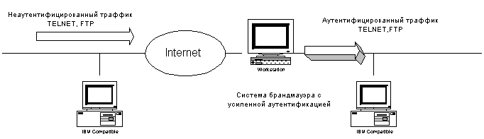 Рисунок 2.2 Использование усиленной аутентификации в брандмауэре для предварительной аутентификации трафика TELNET, FTP