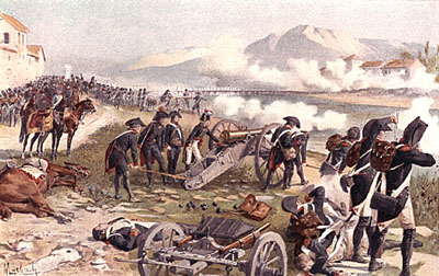 15 ноября 1796 г. начался, а вечером 17 ноября окончился упорный и кровопролитный бой при Арколе. Альвинци, наконец, столкнулся с Бонапартом. Австрийцев было больше, и сражались они с чрезвычайной стойкостью - тут были отборные полки Габсбургской монархии. Одним из самых важных пунктов был знаменитый Аркольский мост. Трижды французы бросались на штурм и брали мост и трижды с тяжкими потерями отбрасывались оттуда австрийцами. Главнокомандующий Бонапарт повторил в точности то, что он сделал за несколько месяцев до того при взятии моста в Лоди: он бросился лично вперед со знаменем в руках. Около него было перебито несколько солдат и адъютантов. Бой длился трое суток с небольшими перерывами. Альвинци был разбит и отброшен.
