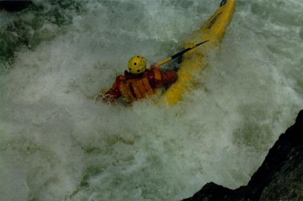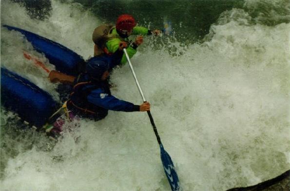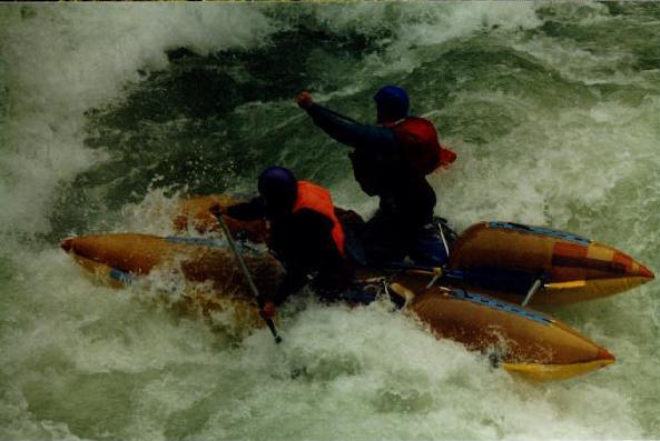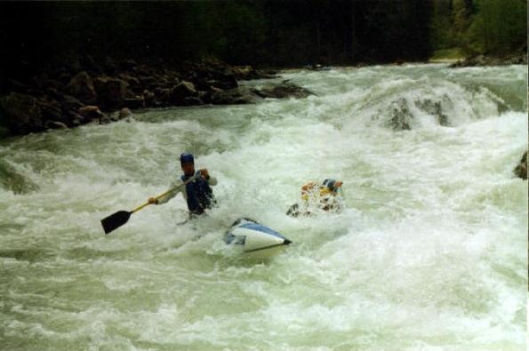 Повреждения: Две согнутые поперечины у ката Кирилла и Сереги, сломанная кница левого баллона третьей поперечины и погнутая в этом месте продолина у "Хавроньи". При разборе полетов были сделаны выводы, что в стабильном состоянии (нахождение Гули с катом в улове у левого берега под "Прощай Родина") не следует хватать первую попавшуюся морковку (которая может оказаться и без карабина) а ждать стопроцентного шанса. С параллельной группой возникли некоторые трения по поводу, что мы всей группой сняли страховку у "Прощай Родина" и ушли в догонку за перевернувшимся катом, создав тем самым трудности в прохождении порога их группе, четверка которой также ушла за Гулей. В наше оправдание можно привести доводы о том, что положение параллельной группы было конечно тяжелым, но не критическим, в отличии от нас, учитывая, что Гулю унесло в каньон и никакой информации о ней мы не располагали. Причем, учитывая далеко не нулевую вероятность оверкиля, в "Сосновом" нам могли понадобится все наши суда. 5 мая. Подъем в 7:00. Вышли в 10:19. До начала каньона "Малый Блып", заканчивающимся порогом "Щель" около 10-12 минут ЧХВ. Ориентир начала каньона - река делает правый, а затем крутой левый поворот, перед правым поворотом - входом в каньон у левого берега обломок скалы пиромидальной формы и завал плавника. Дорога подходит к реке и хорошо видна с воды. Через 150 м. крутой правый поворот с прижимом к скальному выступу и косой бочкой у левого берега. Проходили по внутренней стороне поворота, заходя у правого берега. Далее следует технический участок с маневрами между камней. На выходе из Каньона русло сужается и реку перегораживает бочка. Слева проносной язык, справа пенный котел. Кирилл с Серегой опять залегли. Кирилл зацепился за кат и его вынесло из бочки, Сергей остался полоскаться. Единственное, что мы успели это уйти чуть влево и упали в бочку гадая, не раздавили ли Сергея. Когда мы прошли бочку и я оглянулся назад у меня внутри все похолодело - Сергея в бочке не было. Правда спустя секунду я увидел его плывущего чуть правее нас. После выхода из "Щели" участок спокойной воды. Волков благополучно добрался вплавь (кролем) до берега, выпустив при этом весло, которое было поймано нашим катом. После поимки Серегиного весла мы и подоспевший Макс занялись спасением катамарана с Кириллом.Однако затолкать кат и плавающего рядом человека в улово не удалось. Кирилл был взят на борт (скорее на раму) двойки, а перевернутый кат был передан подоспевшей четверке. Кирилл был высажен на берег, а двойка и каяк ушли вдогонку за четверкой и перевернутым катом. Но, как оказалось, они и сами люди взрослые и, когда мы подошли, двойка уже была загнанна в улово (11:50). У девичьей двойки при прохождении каньона порвался упор и им пришлось зачалиться в середине каньона. Их ждали около часа (починить упор им помогали Макс с Лехой). в 12:50 отплыли дальше. До автомобильного моста (ориентир начала "Соленых скал" 10 минут ЧХВ. По дороге есть места для стоянок. Чалка за