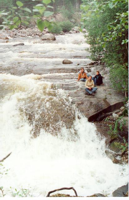 На следующий день Сергей - на рыбалку, на этот раз удачную (форель, щучки), а мы - на экскурсию. Посмотрели нижнюю ступеньку: широкий маловодный слив, кое-где переходяший в водопад,
