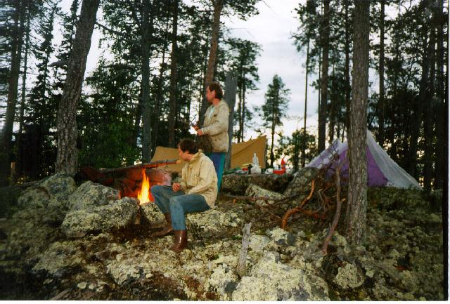 Выплываем на озеро Тованд. Все тихо, вокруг ни души и ни одной стоянки. На сегодня хватит. Вокруг по берегам мелкие каменистые холмики с мелколесьем - старая гарь. Наконец, в заливчике, куда впадает ручеек из озера Копыт, на левом берегу находим полку и вылезаем, но здесь места мало. В результате, здесь живут байдарки, а мы - на 50 метров дальше от берега на верхушке холмика.